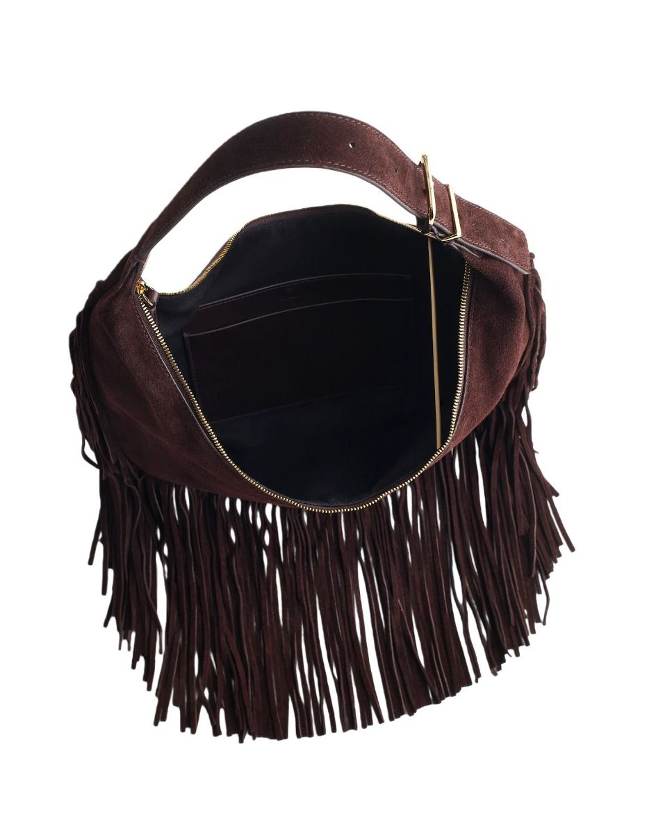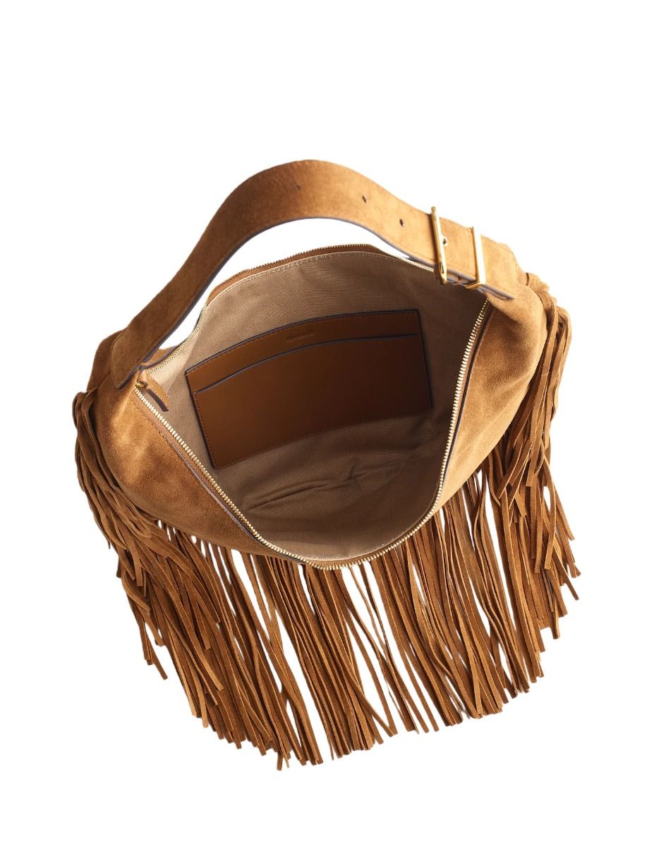 quietly luxe. With a secure top zipper and interior pocket, this suede slouchy bag is trimmed with fringe and perfectly sized to hold an iPad, water bottle, phone, wallet and keys—plus, it has an adjustable strap that can be worn crossbody or over the shoulder. It's so good, it's Essential.